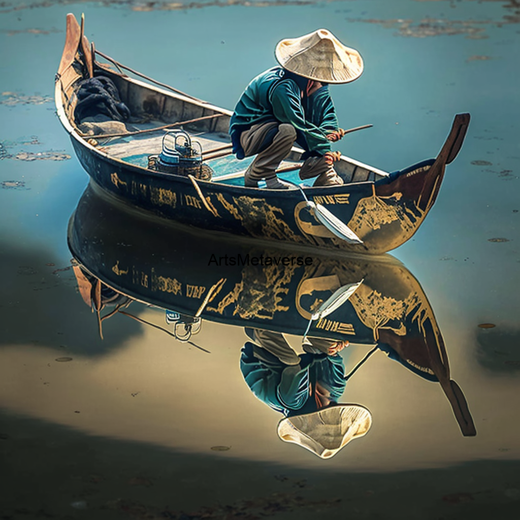 And then there’s the fisherman. He’s sitting calmly in the boat, his eyes trained on the water as he waits for the fish to bite. He’s dressed in a simple shirt and pants, with a traditional conical hat shading his face from the sun. He looks completely at ease on the water, as if this is where he belongs.